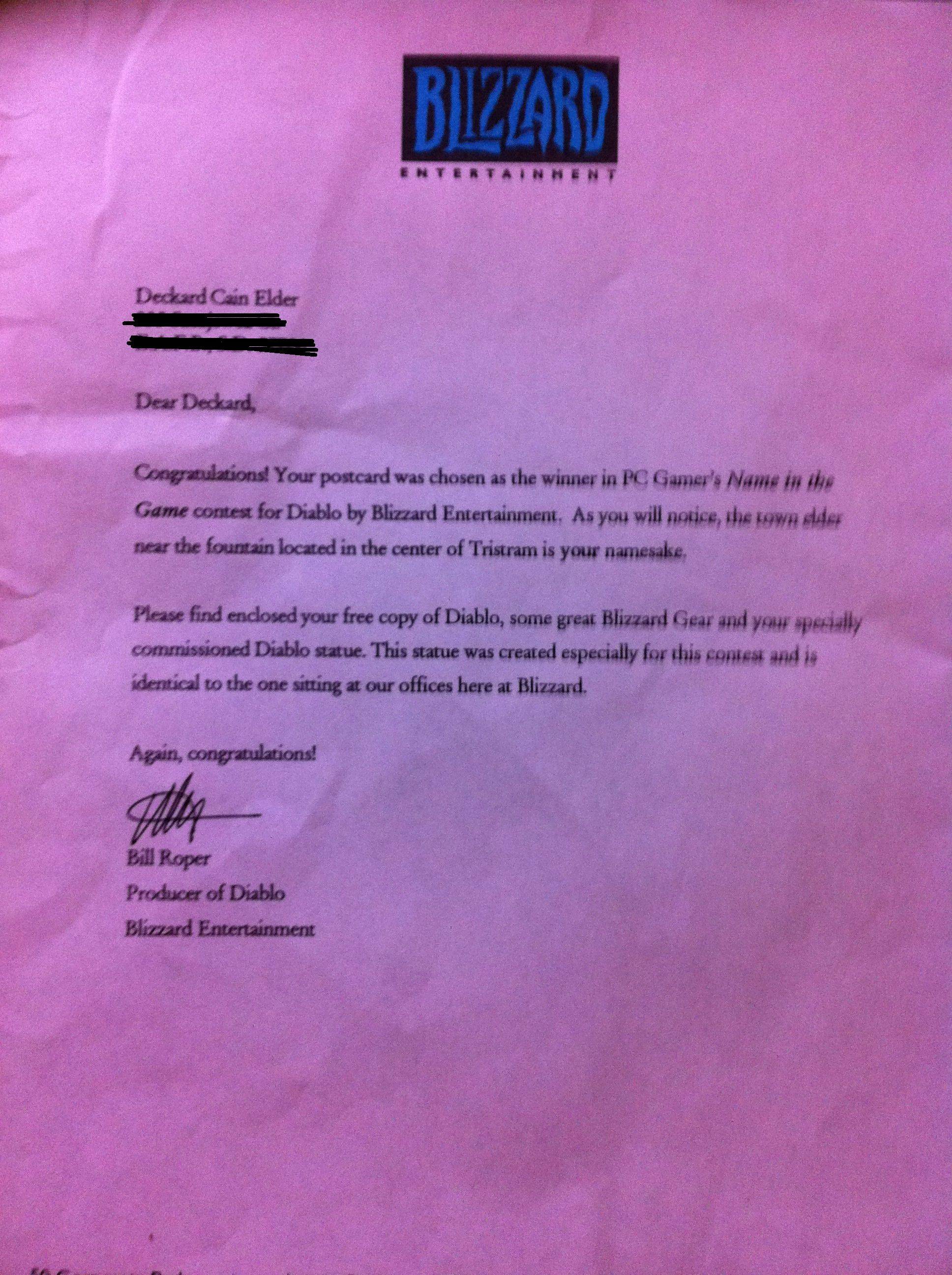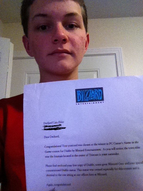 Quando aprirono la scatola c’erano cinque cose dentro: una lunga busta gialla, una copia di Diablo, un cappello nero con Blizzard in blu stampato sul davanti, una maglietta di Diablo molto grande e una statua blu di Diablo alta poco più di un metro. All’interno della busta c’era una lettera di Bill Roper, il produttore di Diablo, che spiegava che ero stato scelto per il premio dell’estrazione.