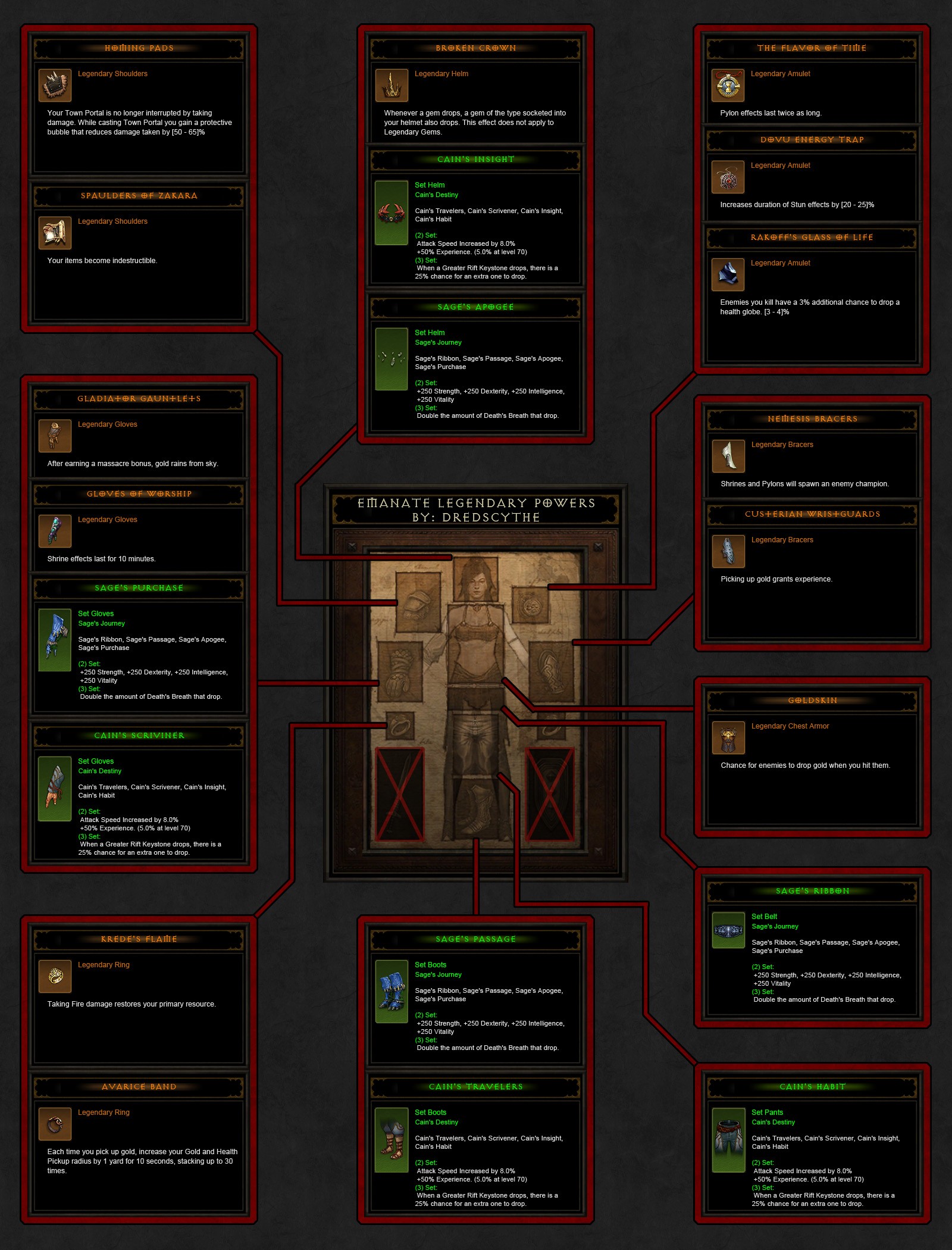 Di seguito trovate una splendida guida visuale realizzata da Dredscythe di BlizzPro, contenente tutti gli oggetti che un Seguace può indossare in grado di fornire al giocatore il potere leggendario attraverso il Sistema Emanazione.
