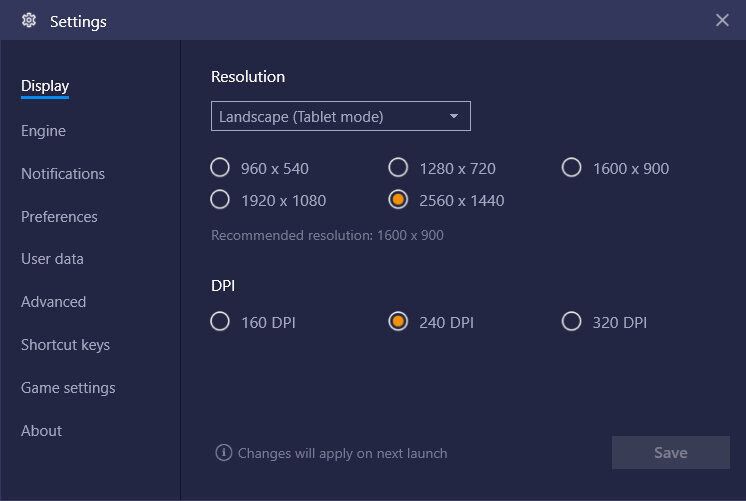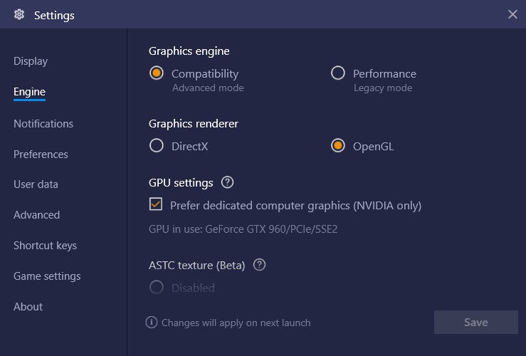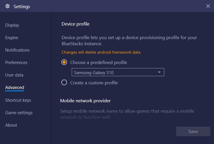 I server di BlueStacks 4 usano Android 7 (Nougat) e la GPU Adreno 540. Il profilo predefinito migliore riporta: