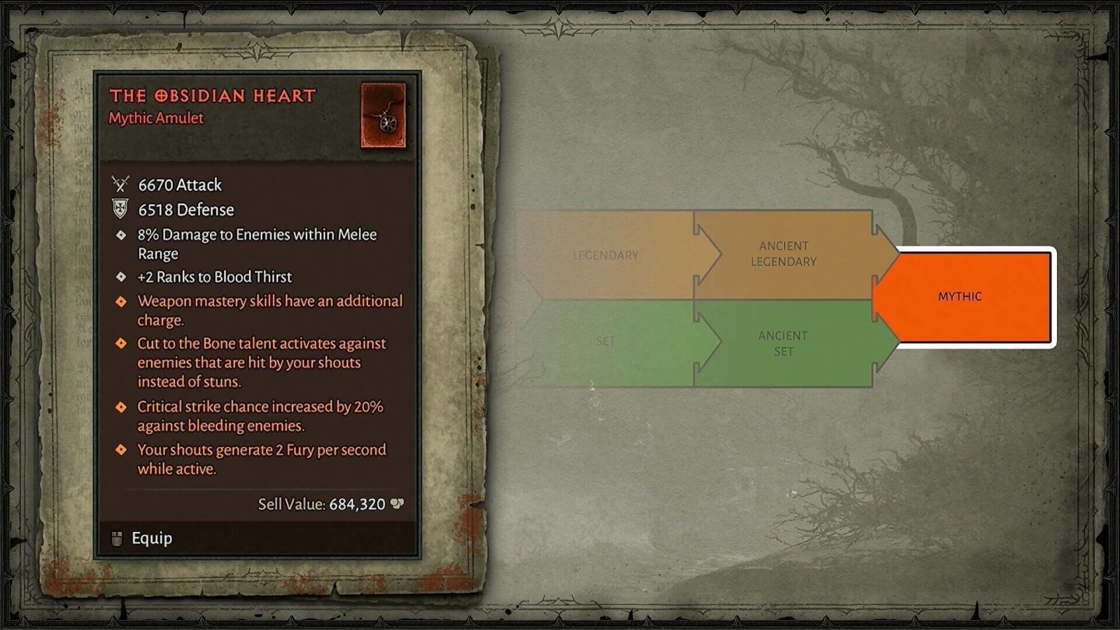 Nella versione di Diablo 4 presentata alla BlizzCon 2019 gli oggetti presentavano uno schema simile a quello del precedente capitolo, con l’introduzione di una nuova rarità che va a posizionarsi nel gradino più alto: gli oggetti Mitici (Mythic).